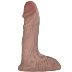 This dildo has a dual density shaft consisting of a firm-core with a squeezably soft exterior. Painted with realistic detailing, including veins and skin shading.