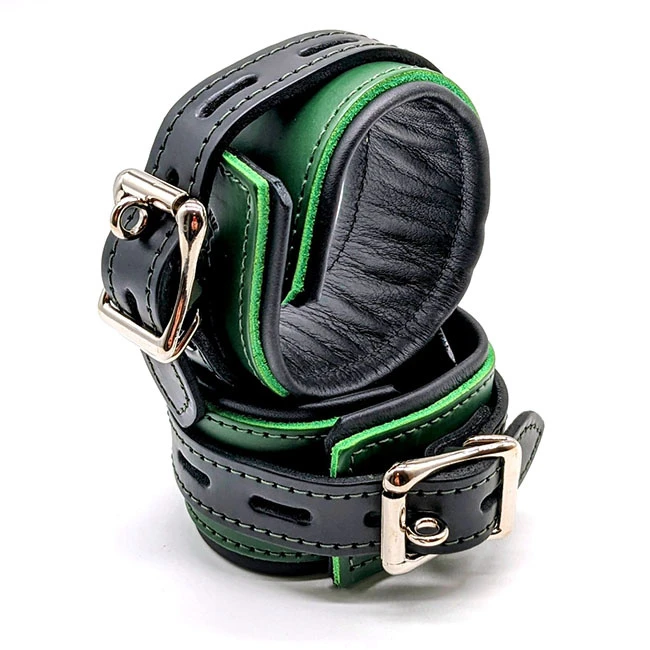 These 1.75″ wide green and black leather restraints are lined with comfortable black leather and feature a locking buckle. The inner leather lining keeps hardware from contacting the skin of the wearer, and is easy to wipe down after use. Each cuff has one metal D ring connector.