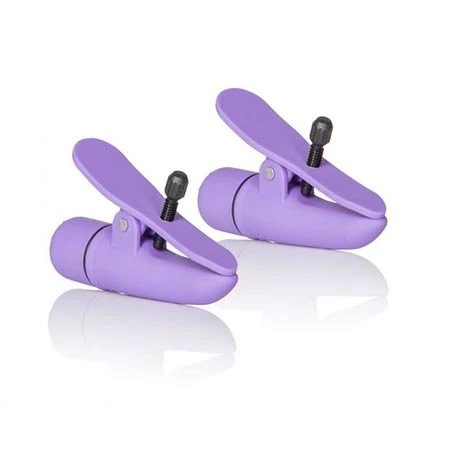 Powerful, self-contained, waterproof, smooth and seamless vibrating nipple clamps. Fully adjustable for comfort and fit. Push button activation. LR44 Batteries included. Available in black, pink, or purple.