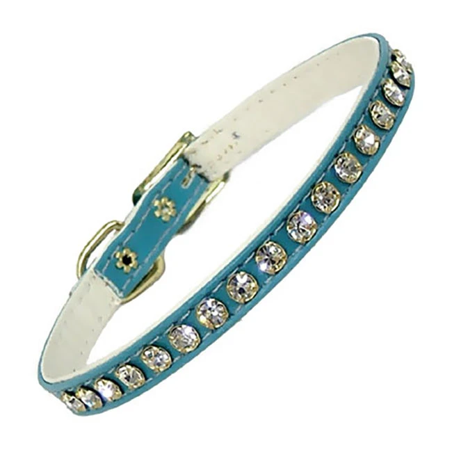 One row rhinestone collar. Sizes: small/medium (fits 14″ to 15.5″) and medium/large (fits 15.5″ to 17.5″). Made in the USA by Kookie International. Turquoise.