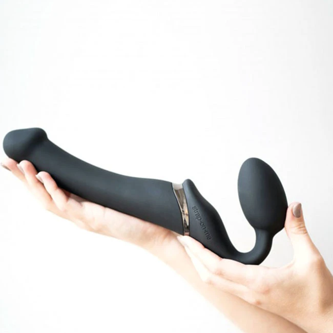 Even more exciting, this version of the Strap On Me Double also vibrates in three separate locations (inside the bulb, near the base, and in the tip), offering even more stimulation to both the wearer and the receiver. A remote control makes it easy to change vibration modes during play.