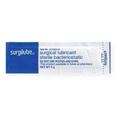 Surgi-lube is a sterile, water soluble, non-staining lubricating jelly. The active ingredient is chlorhexidine gluconate. Available in 5 gram packets; great for travel.