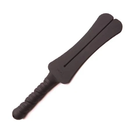 Trip 2 Tawse features two very broad tongues, each 1.6 inches in width, 8.75 inches in length: this allows for long, broad strokes. Because it is made of silicone, it transmits energy very effectively and takes very little effort in terms of strike force. Start slow and build up momentum with this toy— it is intense!